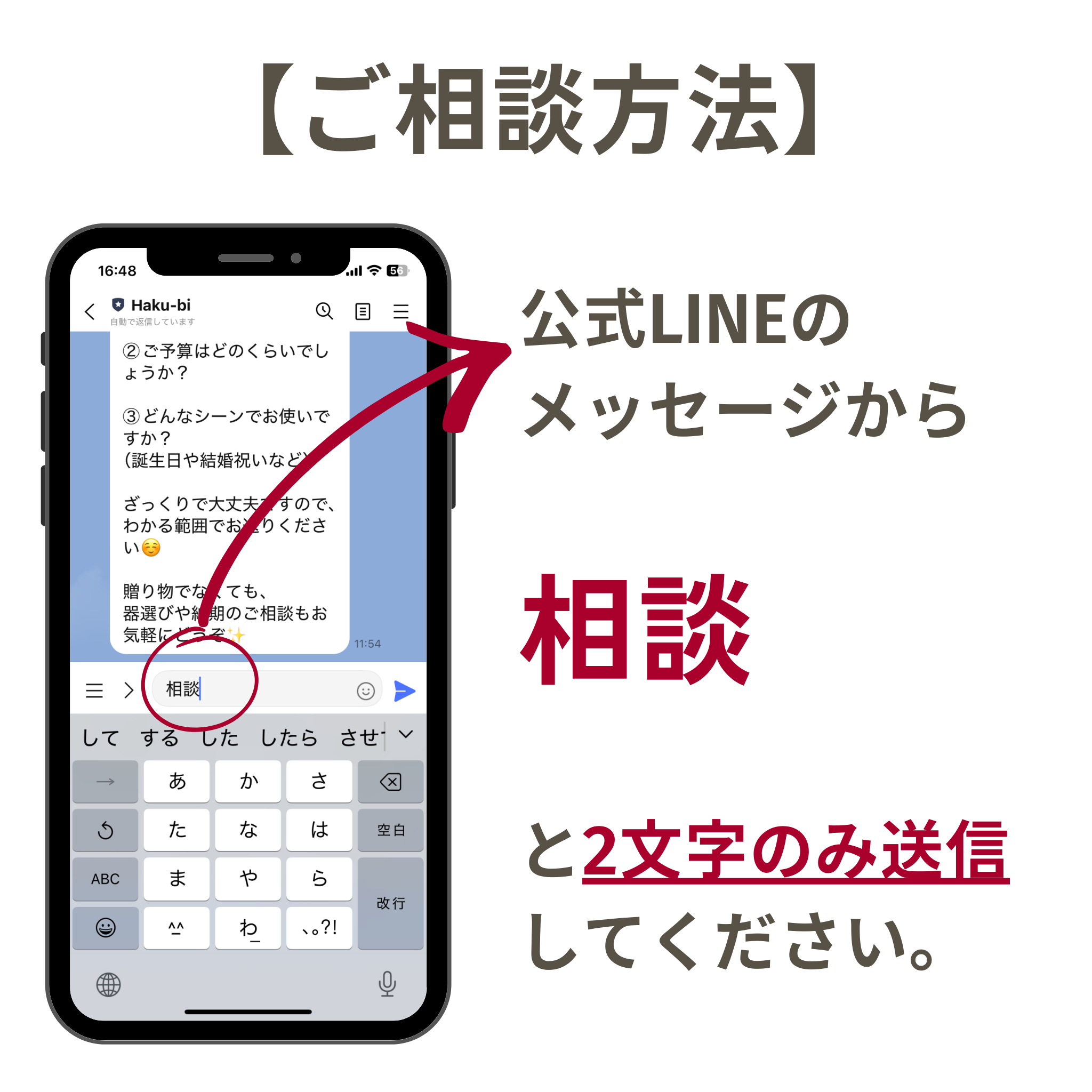 LINEから 相談 と2文字を送信するだけ!